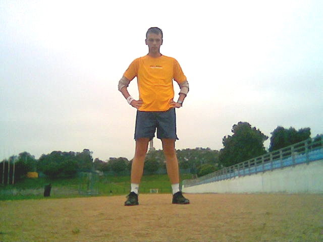 | Postawa a'la Piotru¶ Pan. To wła¶nie ja - podczas pierwszych tygodni biegania. Zwróćcie uwagę na okr±gły przedmiot pomiędzy biodrami, a torsem.