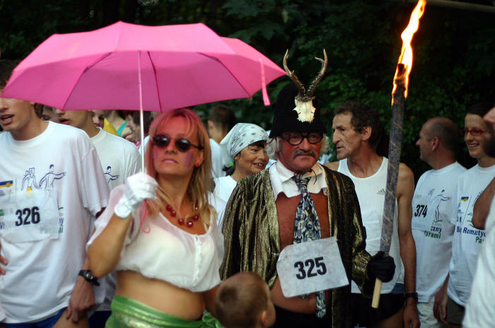 | Fotka z organizowanego co roku "Biegu Romantycznego" w Ustroniu z sierpnia 2006r. Moim partnerem był Jasiu T.- fantastyczny propagator biegania. 2 razy uczestniczyłam w startach w Ustroniu i za każdym razem ¶wietnie się bawię (dla urozmaicenia przebieramy się w dziwne stroje)