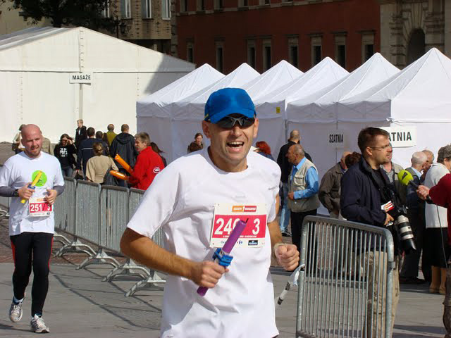 Marysieńka (2009-10-01,13:13): A ta minka to u¶miech czy "walka" o czas???? ZBYSZEK1970 (2009-10-01,13:21): I jedno i drugie Marysiu:-) Isle del Force (2009-10-01,19:32): Normalnie tylko zwiewać z drogi przed takim ¶cigaczem. Grażyna W. (2009-10-02,01:59): ¦cigacz, w dodatku z pałk± :))) barbara69 (2009-10-02,12:47): jako autorka zdjęcia uważam, że to u¶miech. Wołałam "u¶miech, u¶miech" - nie zważaj±c pałkę w dłoni:-) ZBYSZEK1970 (2009-10-02,12:59): Potwierdzam słowa Basi. Z u¶miechem na ustachsztafeta nr 246 przebiegła maraton w czasie niewiele dłuższym niż 3:15 i zajeła dobre 57 miejsce (na 217 ekip). I mniejsza już o t± pałkę :-))))))