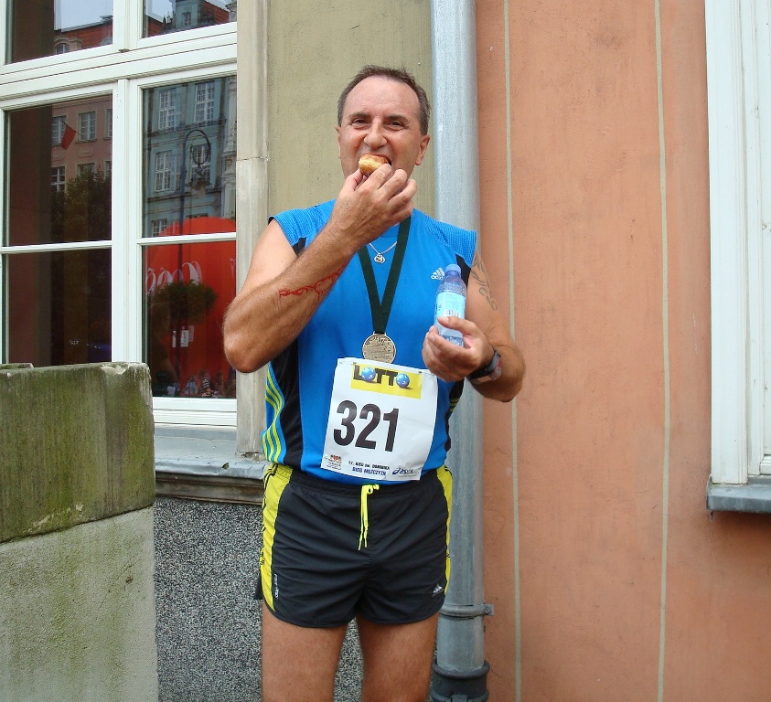 | XVII Bieg ¦w.Dominika.GDAŃSK.2010-08-07.Polała się krew..Ten pyszny p±czek miał mi zrekompensowac ból jakiego doznałem na jednym z ciasnych wiraży,gdzie zahaczyłem o pier¶cionek opartej ręki na barierce jakiej¶ uroczej turystki(?);))