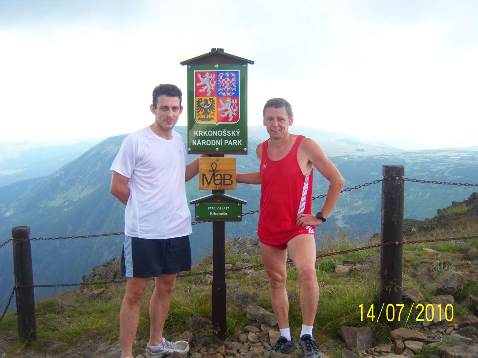 | ¦nieżka "zdobyta" 13 lipca 2010 r. - ja i Grze¶ z wizyt± u Czechów - he,he - a potem biegusiem w dół i za 55 minut będziemy w Karpaczu.