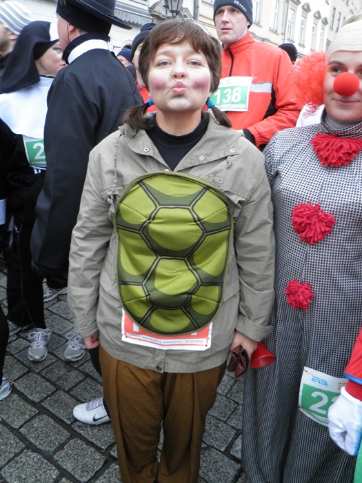 | W ostatniej chwili, przed strzałem do biegu, przepięłam żółwi± skorupkę z pleców na brzucho;) Krakowski Bieg Sylwestrowy 2011:) w doskonałym nastroju!:)