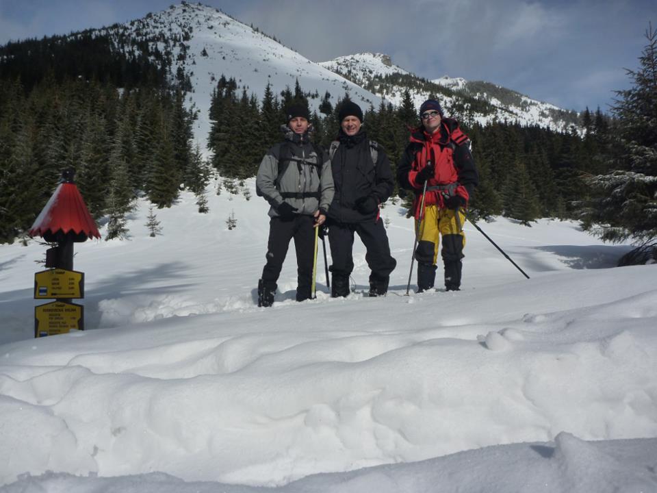 | Przełęcz Bobrowiecka ze znakami, które powinny być na wysoko¶ci twarzy... I w ogóle na tej fotce wszystko jest nie tak, np. moi przyjaciele nie dopasowali się kolorami ubrań do grzybka!!!! Tatry, 25.02.2012.