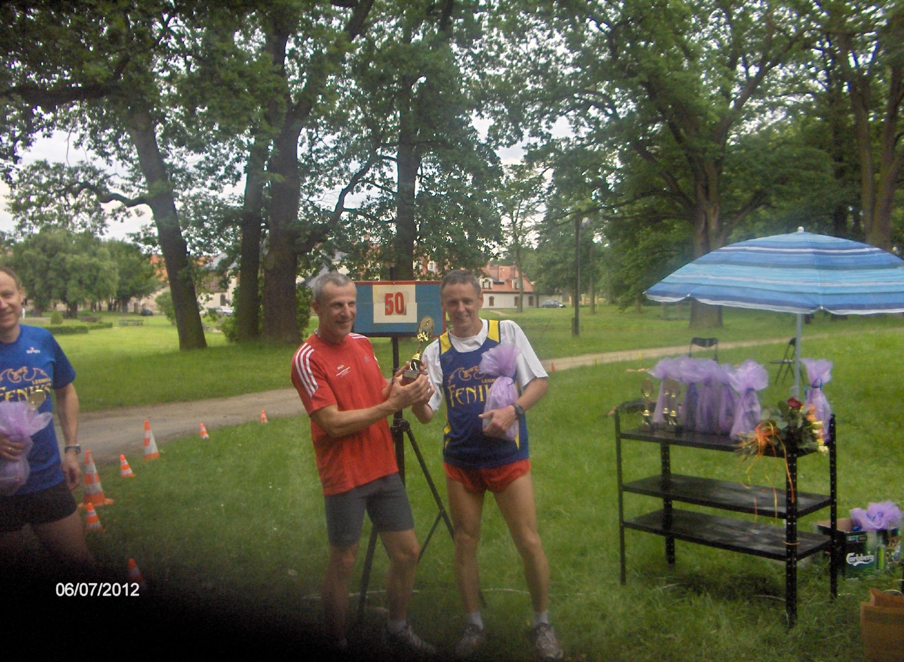 | W podziękowaniu za udział w "mojej 50-tce" - dla wszystkich biegaj±cych ze mn± - pami±tkowe statuetki i "małe co nieco" na drogę.