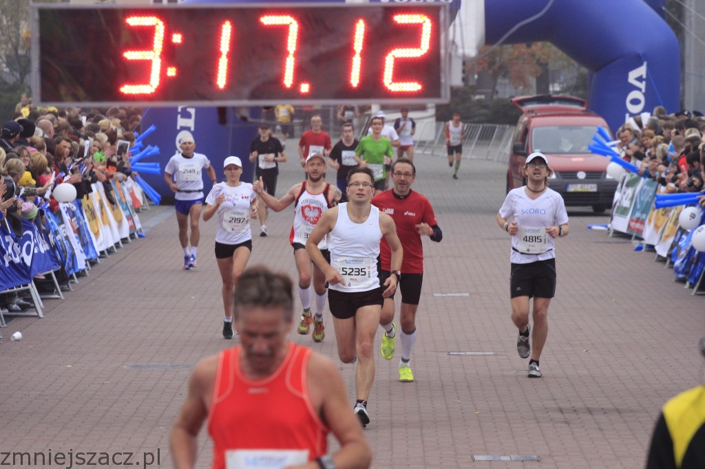 | Finisz Poznań. Pan w czerwonym stroju, bez numeru startowego, doł±czył się do maratonu na ostatnich kilometrach....