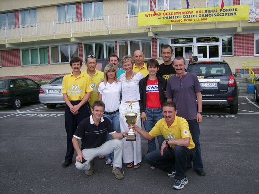 | Wspólne zdjęcie z zaprzyjaĽnionymi biegaczami po czterech dniach zmagań,przed budynkiem OSiR Hetman Zamo¶ć.