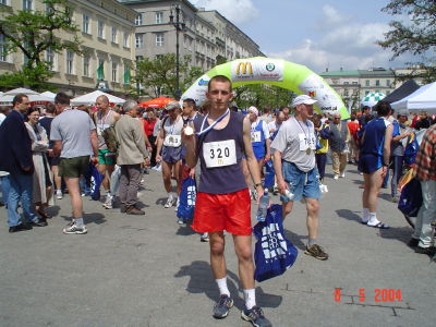| Na mecie mojego pierwszego maratonu CRACOVIA MARATON 2004