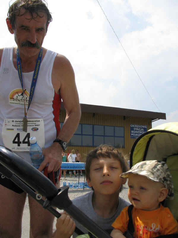 | "Sztafeta pokoleń" dziadek czyli ja, syn Mateusz i wnuk Olivier zdjęcie wykonano dnia 10.06.2007r. po biegu w Rudawie.
