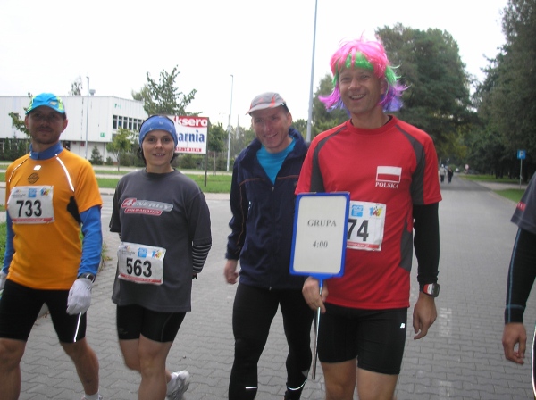 Wbrew tabliczce nie jest to grupa na 4.00, tylko grupa pacemakerów na rozmaite czasy, którzy prowadz± bardzo przerażon± debiutantkę na start:)