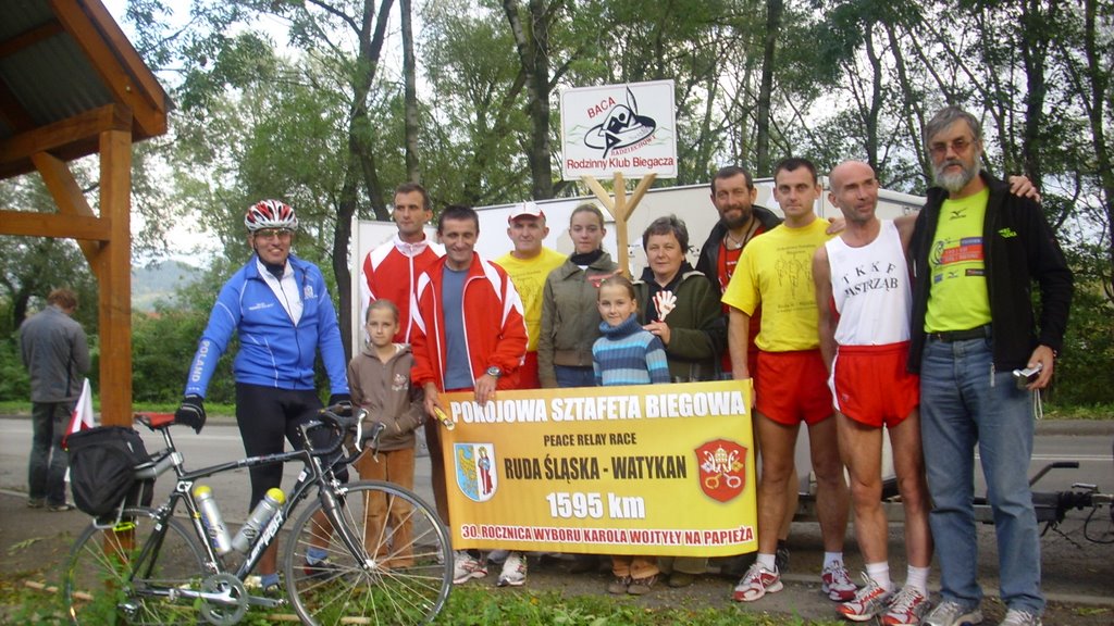 Skomentować zdjęcie moga tylko PRZYJACIELE czytelnika. Edek (2008-10-03,18:30): Sztafeta Pokoju Ruda ¦l±ska - Watykan 1595 km, na zmianie w Radziechowach z grup± biegaczy RKB "BACA". 3.10.2008