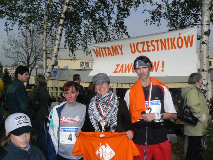 | I Żorski Bieg Uliczny - po wszystkim, zadowolona? Nie bardzo kolka doskwierała mi od 6 km. Na zdjęciu ze znajomymi Wiktori± i Posejdonem ;) z Żor