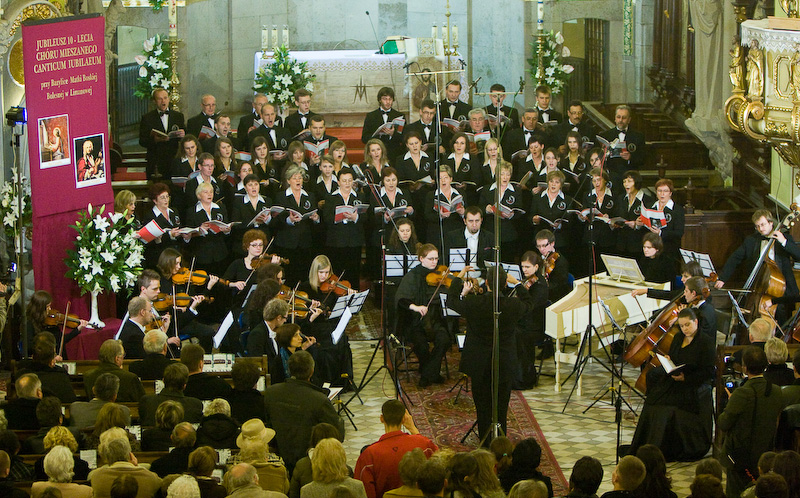 | Zdjęcie zrobione podczas wykonywania Koncertu "GLORIA" Antonio Vivaldiego, w Bazylice MBB w Limanowej, dn. 16.11.2008 (z okazji Jubileuszu 10-cio lecia istnienia naszego chóru). Na zdjęciu: nasz chór "Canticum Iubilaeum" (co znaczy "Rado¶ć ¦piewania") z Limanowej wraz z "Orkiestr± Akademii Beethovenowskiej" z Krakowa.