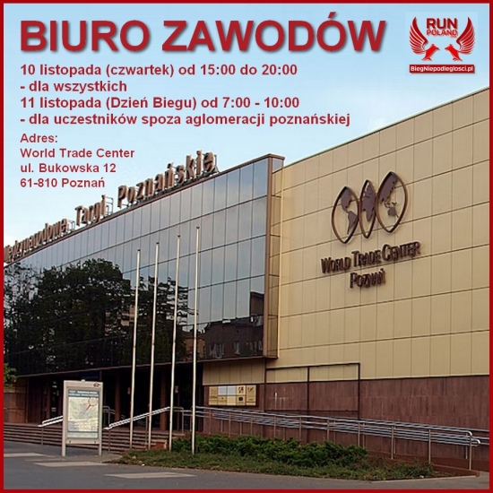 Biuro zawodów, akredytacje oraz depozyty zlokalizowane będą na pierwszym piętrze w budynku World Trade Center , ul. Bukowska 12, 61-810 Poznań. - 10 listopada (czwartek) - godz. 15:00-20:00 (otwarte dla WSZYSTKICH) - 11 listopada (piątek - dzień Biegu) - godz. 7:00-10:00 (otwarte tylko dla uczestników SPOZA aglomeracji poznańskiej nie objętych komunikacją MPK w strefach A+B+C*) - ZOBACZ
