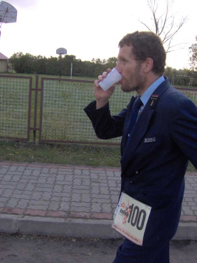 Byłem pełen optymizmu, pomimo że czułem już cały bieg w kościach. Miałem niespełna 2 godz. (nie pamiętam w tej dokładnie ile) na pokonanie ostatniej 15 km pętli, żeby zmieścić się w czasie poniżej 11 godz. Teraz na trasie towarzyszył mi syn z kolegą klubowym - Tomkiem. Stali na poszczególnych kilometrach dopingowali i podawali mi picie. Ostatnie 10 km odliczali (co km), ile pozostało mi do mety. Takim dopingiem, pomimo biegnięcia pod wiatr pokonałem dość szybko i zameldowałem się na ostatnim punkcie. Stało się realne - jak nie stanie się nic nie przewidzianego na trasie - powiniem bez problemu "złamać" 11 godz. Odliczanie trwało, a ja żeby chłopaki na mnie długo nie czekali, starałem je pokonywać w miarę szybko. Tak się rozpędziłem że ostatnie 2 km przebiegłem najszybciej z wszystkich pokonanych kilometrów drugiej części biegu ( a może nawet całego supermaratonu ) I Jest meta na, którą wbiegam bardzo zadowolony w czasie 10:53:08. Pokonałem dystans 100 km i zmieścilem się w 11 godz, pomimo trudności na trasie. Z czasu nie byłem do końca zadowolony i czułem lekki nie dosyt - przecież plany były inne, a zarazem zły na siebie za nie prawidłowy dobór obuwia. Była duża szansa na zrobienie planowanego czasu. Było by to tyle na opisywanie mojego.