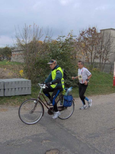 Mamy za sobą 40 km. Jest dobrze, chodź wiedziałem, że dla mnie będzie tradycyjnie najgorszy odcinek pomiędzy 40 - 60 km. I się nie myliłem. Nastąpiło to dokładnie na 44 km. Poczułem nagle odrętwienie prawej nogi, tak boleśnie jakiego nigdy na takim dystansie nie miałem. Byłem tym faktem trochę zdziwiony. Spodziewałem się raczej kłopotów z stawami kolanowymi, lub spadku ogólnego organizmu. Tym razem było inaczej. W tym miejscu musiałem się pożegnać z Marianem. Biegłem już wolniej, lub raczej można powiedzieć że człapałem, ale nie chciałem się poddać. Wytrzymałem tak do 47 km. Tam pierwszy raz zastosowałem moją wypróbowaną taktykę: bieg - marsz - bieg. Ból nogi narastał, by po chwili maleć. Było to tak zw. "rwanie nogi". Tak dotarłem do 50 km. Czasowo nie było tak źle (4:48), ale z kondycją było o wiele gorzej.