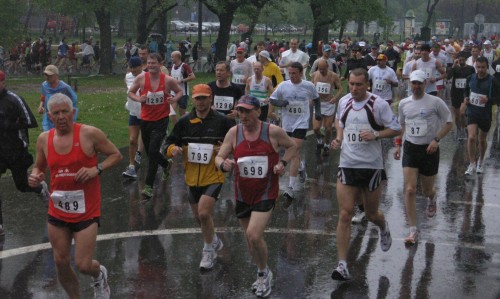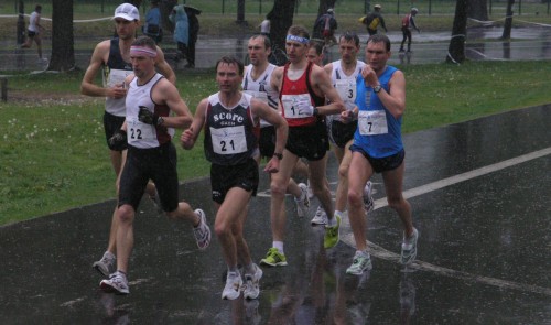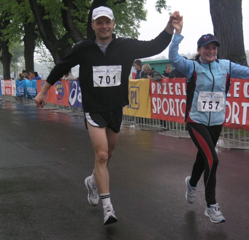 Jak się okazała moja żona znalazła sobie innego peacemarkera i to młodszego. Finisz miała piorunujący i czas na mecie 3:52:12 jak na warunki krakowskie uznać należy za doskonały. A ja jakieś 100m przed metą miałem taki skurcz całej nogi, że stałem w miejscu ok 2-3 minut i dopiero po tym czasie doczłapałem się na metę witany przez żonę w skowronkach. Jak się okazało 2 połówkę maratonu moja żona pokonała w czasie ponad 3 minuty szybszym niż pierwszą. I to była recepta na rekord w tym dniu. Przygotowywała się do tego biegu pieczołowicie przez całą zimę czy mogłem jej odmówić tych butów? I nie odmówiłem. W poniedziałek udaliśmy się do sklepu po te buty – pamiątkę 6 maratonu w Krakowie.