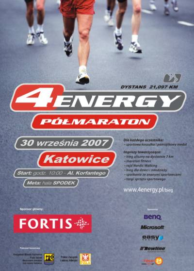 Całe to przedsięwzięcie nie było by możliwe bez wsparcia sponsorów. Tegoroczny półmaraton 4energy wspierają: Sponsor Główny – FORTIS oraz sponsorzy: Microsoft, Easy Touch, REPORTER, Newline oraz Tele24. Dużą pomoc oferuje również Urząd Miasta Katowice obejmując mecenatem nasze zawody.