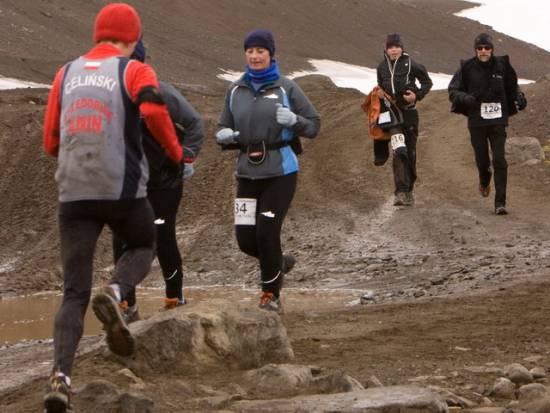 W czasie tegorocznego maratonu na Antarktydzie były dość dobre warunki - 2 stopnie na plusie, bardzo mało śniegu, błoto dało się omijać, a siła wiatru była do wytrzymania. W poprzednich edycjach brało udział kilku profesjonalistów (maraton w granicach 2:20, 10 km poniżej 30 minut), ale wykończył ich śnieg, wiatr i lodowiec. Moje rady dla antarktycznych śmiałków: nie można szaleć na kamienistych plażach, trzeba uważać przy strumieniach, a szczególnie na lodowcu. Do tej pory mam wielkiego siniaka na pośladku po fatalnym upadku na zbiegu.