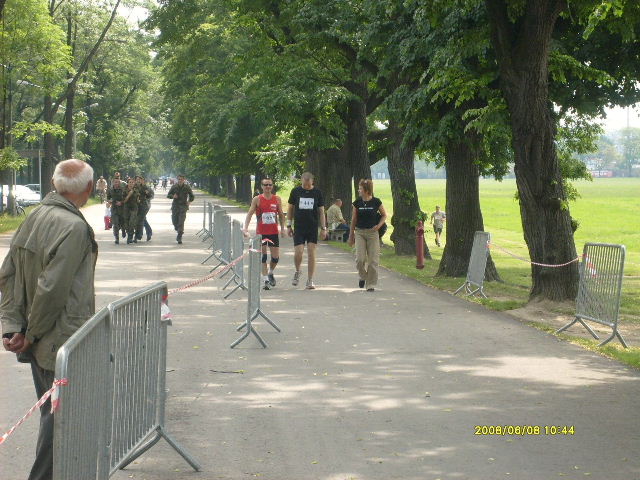 Wyjazd mój i żony Krystyny został zaplanowany na dwa etapy: udział w zawodach i zwiedzanie miasta. Plan pozornie wydawał się prosty, tylko z wykonaniem jego mogły być problemy. Po 10 godzinach jazdy pociągiem dotarliśmy na miejsce. Pogoda zapowiadała się dobra do biegania - było dość pochmurnie. Z dotarciem na miejsce biura zawodów ( Błonie ) pomogła nam informacja turystyczna mieszcząca się w pobliżu dworca. Biuro mieściło się w namiocie przy skałce Papieskiej, gdzie trwał już 10 dni Bieg Kwietny. Uczestnicy biegnąc sztafetą będących hołdem dla dokonań Ojca Świętego Jana Pawła II na rzecz niepodległości Polski, mieli do pokonania 1000 okrążeń ( 3530 km ) wokół Błoni. W tym samym czasie ich koledzy wystartowali z Kołobrzegu ( 26 maja 2008 o godzinie 17:00 ), aby w 15 dni obiec Polskę i 10 czerwca zakończyć go w Kołobrzegu.