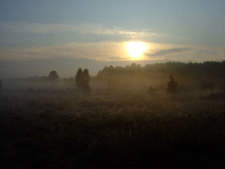 Leśna droga prowadzi prosto w kierunku Lasocina. To wieś położona na zachodnim krańcu Puszczy Kampinoskiej, kilka kilometrów od Sochaczewa. Mijamy kilka wielkich, pomnikowych dębów. Coraz częściej zdarzają się odkryte kawałki, pola i łąki, na których jest jeszcze zimniej niż w lesie. Robi się też coraz widniej, dochodzi szósta. Na łąkach widać, że był przygruntowy przymrozek, rośliny są oszronione. Kapitalnie wyglądają czubki drzew i krzewów wśród pól, wyłaniające się z fantastycznych smug mgły. Pit zafascynowany robi zdjęcie za zdjęciem. Klimaty są rzeczywiście niesamowite. Warto było się wybrać na ten maraton choćby dla tego czarodziejskiego świtu. Będzie słoneczny dzień, na wschodzie robi się coraz jaśniej, ale słońca jeszcze nie widać.