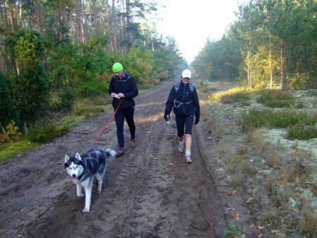 Zasuwamy w pięciu leśną drogą z Truskawia do Zaborowa Leśnego, pokonujemy jej krótki wybrukowany fragment poprowadzony przez wydmę. Ja i Pit stwierdzamy, że dla nas tempo jest zbyt ostre, jeżeli mamy wytrzymać 100 km. PiotrekMarysin żegna się z nami i wraz z Konrozem i Bemolem ucieka do przodu. A ja, Pit i Szara przechodzimy do marszu. Po drodze wyprzedzamy kilku maszerujących w maratonie piechurów i piechurek, będzie ich jeszcze na trasie wielu.