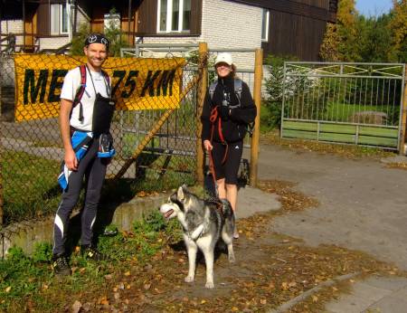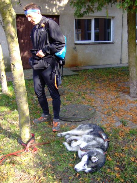 Znowu pojawiają się zabudowania, najpierw pojedynczo, potem grupami, wreszcie ciągiem. Droga z gruntowej przechodzi w asfaltową. Doganiamy prowadzonego przez kogoś na smyczy dużego malamuta. Szara zawiera z nim znajomość, Pit robi zdjęcia obu psom. Rozmawiamy z właścicielem malamuta, który wystartował z nim o 20.00 i za chwilę kończy swój udział w maratonie na mecie 50 km w lasocińskiej szkole.