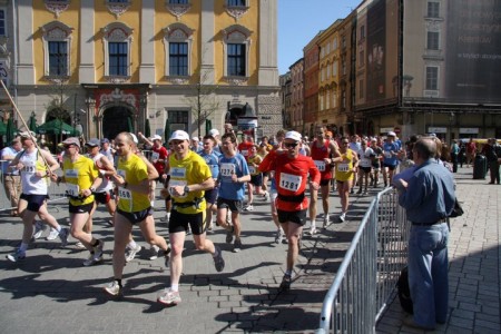 Zobaczyłam na starcie męża, to dobry znak- pomyślałam. Najpierw okrążyliśmy Błonia , dostrzegłam koleżankę, która ściągnęła mnie do Krakowa, życzyła mi powodzenia. Ruszyliśmy zwartą grupą na Rynek. Nieopodal Barbakanu był kanciasty trakt, na szczęście organizatorzy zadbali o nasze nogi; ten odcinek pokryto gumową matą.