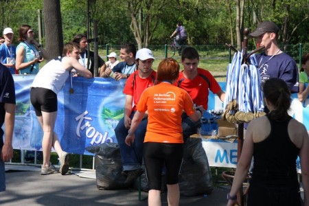 W stronę Nowej Huty udało mi się trzymać w zasięgu grupy biegnącej na cztery godziny. Przez chwilę nawet biegłam trzymając tabliczkę z napisem 4.00. Zaufali mi, że dam radę, dzięki. Ale zaczęło do mnie docierać , iż nie dobiegnę z nimi do mety. Po drodze wypatrywałam stanowisk z wodą , na każdym rozdawali nasączone gąbki, można było też zabrać wodę w butelce, polewając się tak radziliśmy sobie na trasie z rosnącą temperaturą.