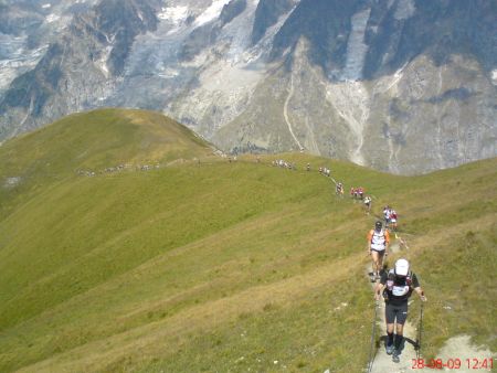 I tak nastał dzień 28 sierpnia 2008, zanotowany dużo wcześniej w kalendarzu wielkimi literami: ULTRA –TRAIL DU MONT-BLANC CCC 2009. Godz. 6 rano – nie ma mowy by cokolwiek przełknąć, do startu pozostały 4 godziny. Jedziemy do Chamonix , gdzie czekają autobusy by przewieźć nas tunelem pod Mount Blanc do Courmayeur. Z numerem 8539 stanęłam w ponad dwutysięcznym tłumie na starcie. Jest to szczególny moment, kiedy miewa się różne stany emocjonalne – radość, duma, obawa, ciekawość, solidarność, lęk, nadzieja …, właśnie nadzieja, że osiągnę metę w Chamonix, towarzyszyła mi po usłyszeniu Marsylianki.
