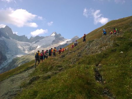 Oby tak dalej – pomyślałam. Wokół piękne widoki, alpejskie ośnieżone szczyty cieszyły oczy; to właśnie dla takich widoków chciałam uczestniczyć w tym biegu. Przed nami wielobarwny sznurek biegaczy wyznaczał trasę, widzieliśmy jak bardzo trzeba będzie się wspinać na drugi najwyższy szczyt biegu Grand Col Ferret 2537m. Lubię podejścia, dlatego na szczyt dotarłam dość szybkim i miarowym tempem o godz. 17:37.