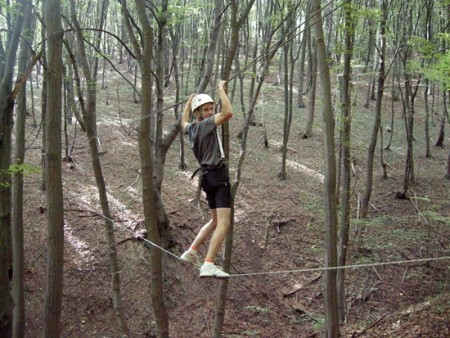 Po mnie wspina się Aneta, która przed wejściem bała się bardziej ode mnie. Tymczasem ze sprawnością małpki wspina się na samą górę i pięknie zjeżdża na dół....jestem pełna podziwu dla niej. Jak ona to zrobiła?! Jeszcze Łukasz, oczywiście bez najmniejszego problemu, i znów przez te upiorne pokrzywy idziemy do punktu jedenastego, czyli do „tyrolki”.