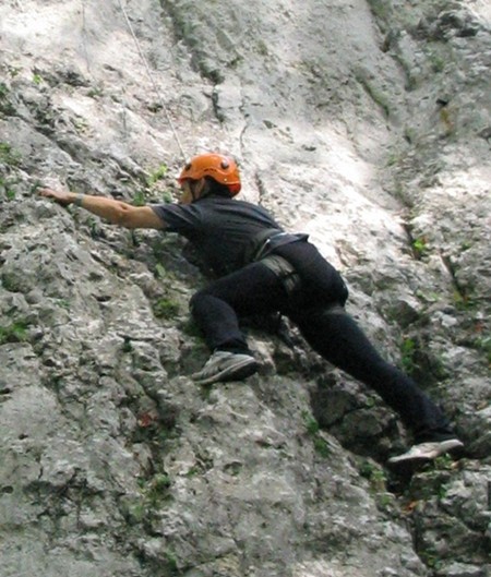 Piotrek ma lęk wysokości, ale zupełnie nieoczekiwanie dla mnie wspina się na samą górę. Znacznie trudniejsze (psychicznie) dla niego jest opuszczanie. Pora na mnie. Pani pomaga mi założyć lonżę i pokazuje, którędy iść najlepiej, udzielając przy okazji cennej rady „Proszę patrzeć gdzie są trawki i liście. Tam gdzie jest zielono, musi być jakaś szczelina, bo przecież one rosną w ziemi a nie na litej skale”. Jeszcze pytam, co będzie, jeżeli na ścianie dostanę histerii. Pani odpowiada, że wtedy mnie opuści, ale przecież nie dostanę:) Jej wiara we mnie jest rozczulająca.... No cóż............włażę!