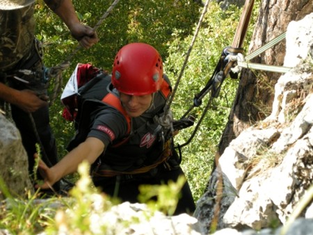 W końcu.....ziuuuuuu...pojechał:) Ziuuuuu...pojechała:) Schodzą na dół rzekazują nam sprzęt i idziemy z Piotrkiem na górę. Po drodze wiem, że choćbym nie wiem jak się bała, to zjadę, bo ja tą samą drogą zejść nie potrafię – co krok osuwające się podłoże, a wszystko upiornie strome. Najpierw jedzie Piotrek, tuż za nim ja.