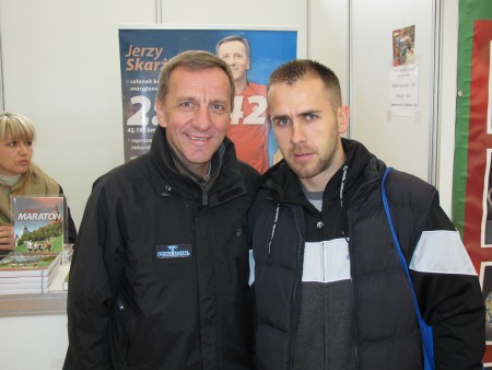 W sobotę rano wsiadłem do pociągu, by wyruszyć na swój maratoński debiut. Podróż minęła szybko i o 13 zameldowałem się w biurze maratonu, gdzie szybko otrzymałem swój pakiet startowy i informacje na temat noclegu w hali „Arena”. Z biura udałem się na Expo, gdzie wymieniłem kilka zdań z panem Jurkiem Skarżyńskim, zakończonych pamiątkowym zdjęciem.