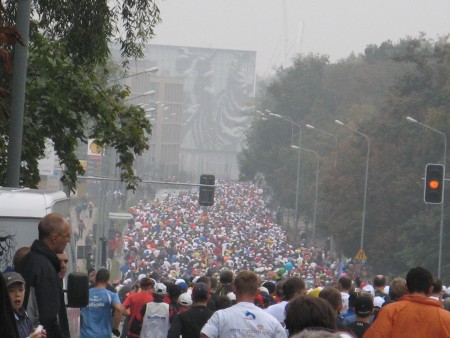Atmosfera w autobusie była bardzo bojowa, wszyscy rozmawiali o biegu, chociaż po drodze zamiast reklam maratonu widziałem trzy banery reklamujące wczorajszy mecz koszykówki pomiędzy PGK Basket Poznań a Kotwicą Kołobrzeg. Około 9 byliśmy już przy biurze zawodów, gdzie bez kolejki i żadnych problemów zostawiłem w hangarze worek ze swoimi rzeczami, po czym truchtając udałem się na start.