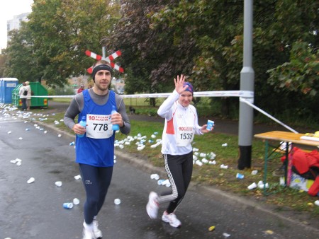Pomału stopniowo posuwałem się do przodu w tempie 6.05 – 6.10min/km. Po drodze skrzydeł dodawały kapele grające na trasie i aż szkoda, że nie biegły obok nas grając cały czas. Po 10 kilometrze zacząłem co kilka minut popijać izotonik, który miałem ze sobą w dwóch małych buteleczkach, niesionych w rękach. Na 15 kilometrze przyłączyłem się do sympatycznej Pani i rozmawiając razem dobiegliśmy niepostrzeżenie do „połówki”.