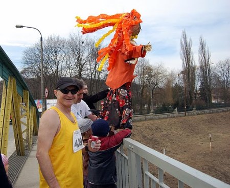 Jeszcze tylko tradycyjnie przed startem Organizatorzy wrzucili tą prawdziwą „Marzannę” do rzeki Rudawy i kukła popłynęła bardzo szybko z prądem rzeki... jakby sugerując zawodnikom tempo biegu,
