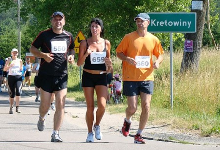 Do startu w tej imprezie udało mi się „namówić” Serdecznych przyjaciół ze Stargardzkiego Związku Weteranów Lekkiej Atletyki ze Stargardu Szczecińskiego, jednego z Gdyńskich pumowiczów, oraz kompana z tras treningowych i klubu Lks Zantyr Sztum, dla którego miał być to pierwszy tak długi bieg. Po dotarciu rankiem do Kretowin i zalogowaniu się w biurze zawodów zacząłem mieć... wyrzuty sumienia. Z nieba lał się żar. Dyskomfort mentalny związany z narażeniem kolegów na „niezbyt” sprzyjające warunki biegowe, złapał mnie za gardło.