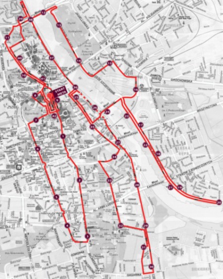 Na wysokości stadionu Polonii, tym razem obieganego z drugiej strony powtórnie znajdziemy się na Bonifraterskiej, a następnie Placu Krasińskich z siedzibą Sądu Najwyższego. Tym razem odcinek ten pokonamy w kierunku Starego Miasta, by po ostatnich kilkuset metrach już w jego obszarze dotrzeć do linii mety, a przez to ponownie znaleźć się na Krakowskim Przedmieściu. W tym miejscu pozostanie już tylko podzielić się wrażeniami z trasy z bliskimi osobami czekającymi na mecie. Wszak jest to zawsze największą nagrodą dla każdego maratończyka. Czego sobie i wszystkim uczestnikom 32 edycji Maratonu Warszawskiego życzę. Do zobaczenia na Krakowskim…