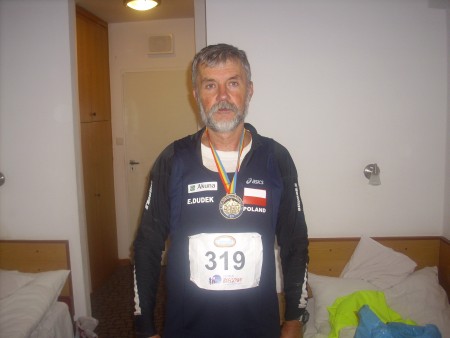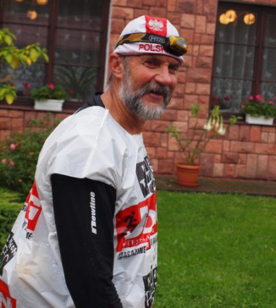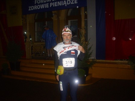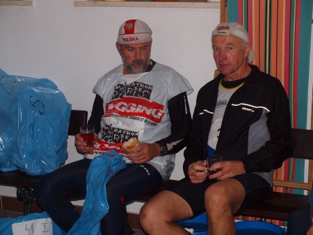 Z Prehyby przez Radziejową i Eliaszówkę to znana trasa do Piwnicznej Zdroju, którą niespełna miesiąc wcześniej pokonywałem w Mountain Marathon w dobrym stylu. Piwniczna Zdrój 65 kilometr biegu, kolejna dolina i bufet z przepakiem. Przed wejściem wita mnie serdecznie stary przyjaciel z Wałbrzycha Wiesiek Zieliński, który obsługuje foto-cele. Na punkcie dochodzę kolejnych zawodników, jest Tadek Ruta z Łodzi, z którym nie raz rywalizowaliśmy na trasach. Biorę kanapkę z szynką i herbatę ( pózniej okazało się, że trzeba było zjeść dwie bułki), odżywki z przepaku zostawiam zużytą latarkę. Siedząc rozmyślam czy jest sens biec dalej, do punktu docierają kolejni zawodnicy. Wiesiek robi pamiątkowe zdjęcie, w worku mam czyste rzeczy do przebrania, leje jak z cebra jestem cały w błocie więc decyzja nie ma sensu się przebierać.