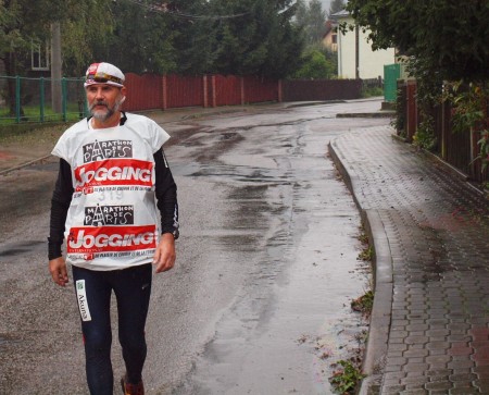Do mety bardzo daleko Wiesiek pociesza mnie i dodaje otuchy Edek „ przecież ty nigdy się nie poddajesz” ( przed laty byłem reprezentantem Polski i Górnika Wałbrzych w biegach narciarskich). Po chwili ruszam, jeszcze jedna fotka na drogę i po raz drugi mostem przeprawiam się przez Poprad. Po drodze spotykam sympatyczną wolontariuszkę i mieszkańców, którzy mnie dopingują i pocieszają. Po zdobyciu kolejnego wzgórza, zaczął się horror, błotnista droga jak maz, buty tracą przyczepność jezdzi się jak na łyżwach, co pewien czas lądując w lepiącej mazi. Po chwili mamy piękną drogę i kolejną dolinę Łomnica Zdrój 70 kilometrów w nogach. Po drodze mijam bar właścicielka zaprasza na piwko, ale jak chciałem się wrócić to zrezygnowała z fundowania napoju chmielowego. Biegnę i idę na przemian, po drodze wykonuję kilka telefonów, że jeszcze walczę z trasą dystansem i własną słabością.