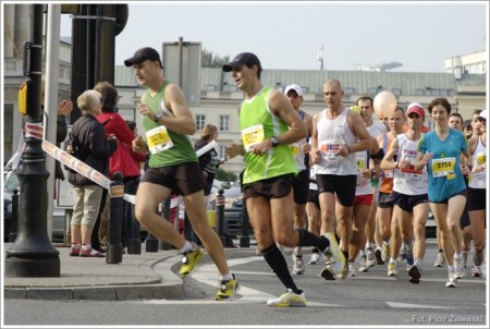 Założenia, jak zwykle, już do znudzenia – 3:10. Moc? – jest! Garminek? – jest! Rozum? – JEST…!!! – ten ostatni darł się najgłośniej i podstawił mi sprytnie pacemakera na 3:10 (sic!). No nie, naprawdę jest grupa na 3:10??? Hura!! Ale fajnie!! :))) Ucieszyliśmy się z Adasiem, który też zdecydował się lecieć na 3:10 (jak sam mówił do połowy, a potem to już do przodu ile sił w nogach). Ustawiamy się na starcie. Jejku Duda, ale luda!!! Szukam swojej strefy i baloników. Przedzieram się przez gęstniejący tłum. Zostały już minuty, a ja wciąż mam jeszcze daleko. W końcu udaje mi się stanąć na właściwym miejscu. O rety!!! Dopiero teraz dociera do mnie, że jeszcze nigdy nie stałem na starcie tak blisko najszybciej biegającej elity – aż ciemno w oczach.