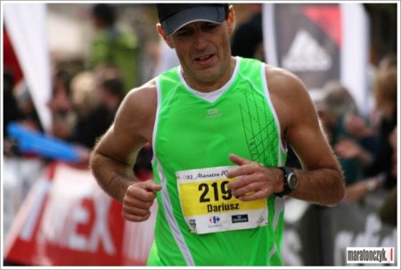 Po 30-tym kilometrze moja grupa zaczęła się rozciągać, rozpadać jak meteor wchodzący w ziemską atmosferę. Od 34 do 39 km tempo spadło mi do ok. 4:45 min/km. Wyraźnie miałem lekki kryzys. Ten większy przyszedł na 40 i 41 km – robiłem je już po powyżej 5 min każdy. Głowa się jeszcze nie poddawała, ale skubane nóżki się obraziły. W końcu obiecałem im, że zaraz na mecie pójdę je wymasować. No to wzięły się znowu do roboty i ostatni kilometr pokonałem już całkiem całkiem :)) A finiszowe 200 m na długo pozostanie w mojej pamięci. Widziałem już zegar i czas jaki pokazywał. Wiedziałem, że kolejny raz plan swoje a życie swoje. Jednak bieg w szpalerze tłumu rozkrzyczanych kibiców, wśród owacji i braw, głośnego dopingu „Dawaj Dariusz, dawaj!!!” (mieliśmy wypisane imiona na numerach startowych) – tego nie da się opisać, to trzeba przeżyć samemu :)