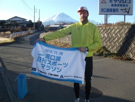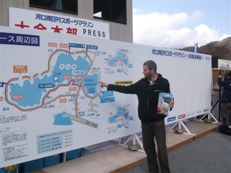 Po przebiegnięciu ok. 12 km wbiegaliśmy na most łączący dwa brzegi jeziora "Kawaguchiko". Za mostem minąłem dwóch zawodników, potem przed 15 km jeszcze dwóch, i na 16 km dogoniłem kolejnych dwóch. Wzmacniając tempo biegu próbowałem ich "zgubić", jednak ci się ostro trzymali. Tak do ok. 23 km, potem jeden zaczął "odpuszczać" i za 25 km zostałem z jednym, który jednak nie chcąc wychodzić na zmiany. Zrobił to dopiero na ostatnich 300 metrach i tak minęliśmy linię mety na 4 i 5 miejscu (ja zająłem to lepsze 5, gdyż jak wiadomo 4 miejsce to najgorsze w sporcie).