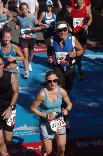 Tydzień przed biegiem temperatura w Chicago wynosiła 15 stopni C, tydzień po biegu temperatura wynosiła 15 stopni C, w weekend biegu temperatura wyniosła ... 28 stopni C. Zaraz po starcie i między wysokimi budynkami centrum biegło się komfortowo – ci, co potrafią skończyć w 2:30 mieli fajnie. My po dwóch godzinach wybiegliśmy na otwartą przestrzeń i po dalszych 30 minutach wiedziałem, że z rekordu nici. Ludzie zaczęli padać jak stonka po azotoksie, wokół karetki na sygnale, mnie odcięło prąd. Organizm skoncentrował się na chłodzeniu a nie na bieganiu. Na metę doczłapałem w 4:13, czyli jeszcze wolniej niż rok wcześniej w Nowym Jorku!! Porażka!!