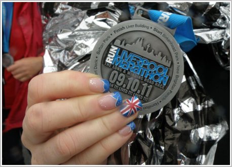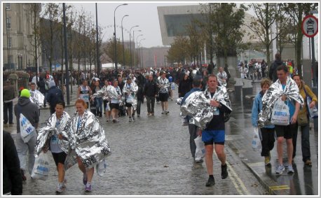 Meta nad brzegiem morza obok dostojnego budynku Port of Liverpool. Tradycyjnie medale, potem koszulki (bawełniane), po kolei picie, folia na plecy i reklamówka z licznymi, drobnymi gadżetami, banany, następne picie i wyjście ze strefy po swój bagaż. Jest możliwość masażu.