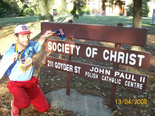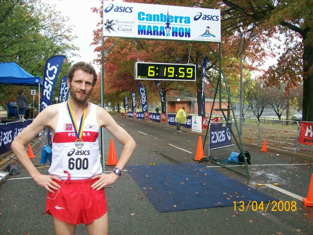 ...w 2008. roku w Międz. Mistrz. Australii w biegu na 50 km ( wyniki powyżej w linku ) w stolicy tego niezmierzonego swoją gościnnością kraju. Dla mnie nie było tam drogo ponieważ oprócz wpisowego ( 90 AD ) na bieg i biletu lotniczego ( z Frankfurtu przez Singapur i Sydney ) nic nie musiałem płacić ponieważ zakwaterowanie ( 1 dzień i noc w Sydney byłem w naszym Konsulacie u v-ce Konsula, a w Canberze 4 dni i noce w Polskim Centrum Katolickim im. JP2 w Narrabundah - dzielnicy blisko startu i mety zawodów ) i wyżywienie miałem całkowicie Gratis.