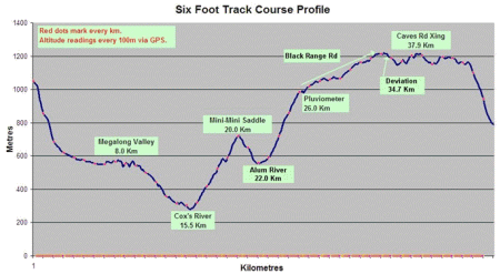 Dla wielu uczestników Six Foot Track to bieg szczególny, który wymaga o wiele większego treningu i niż przebiegnięcie normalnego maratonu. Różnica wysokości trasy pomiędzy najwyższym i najniższym punktem dochodzi aż do 800 metrów! Trasa biegu rozciąga się wzdłuż Gór Błękitnych ok. 100km na zachód od Sydney. Jest to 5 największy maraton w Australii, ale największy wśród tych nie rozgrywanych na ulicy.