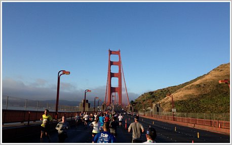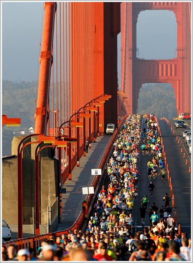 The Wipro San Franciso Marathon jak na warunki amerykańskie to przeciętnej wielkości impreza. Sam maraton w tym roku ukończyło 5819 osób. Wszystkie biegi towarzyszące, wliczając w to uczestników dwóch półmaratonów i biegu na 5 km, zgromadziły około 16 tysięcy biegaczy. Forma organizacji biegów towarzyszących jest bardzo ciekawa gdyż do wyboru są... dwa odrębne półmaratony !! Można więc pobiec w pierwszej lub drugiej połówce maratonu. Po analizie trasy nie miałam wątpliwości, którą wybrać. Pierwszy półmaraton prowadził przez Golden Gate Bridge! Możliwość przebiegnięcie tym mostem stanowiła dla mnie największą atrakcję.