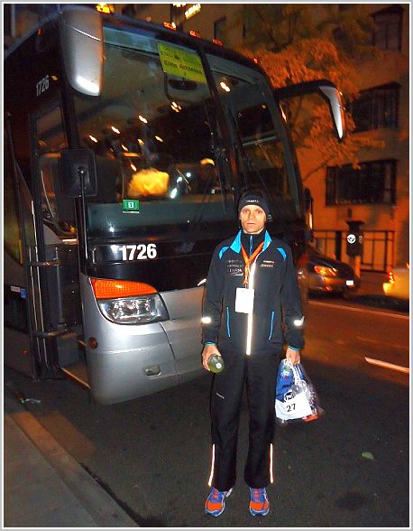 Z racji tego, że start maratonu nowojorskiego rozpoczyna się z wyspy, która jest oddalona około 30km od linii mety, wszyscy zawodnicy muszą być tam przetransportowani. Jest to spore wyzwanie dla organizatorów. Część osób jest przewożona lądem, część statkami. Elita jest w uprzywilejowanej sytuacji, trzy autokary są eskortowane przez policję przy blokadzie innych dróg. Błyskawicznie przedostajemy się na wyspę. W okolicach startu duże zabezpieczenia, każdy z zawodników i organizatorów był skanowany. W odległości około 500m od startu rozstawiono namiot, w którym można było skorzystać z masażu i drobnych przekąsek.